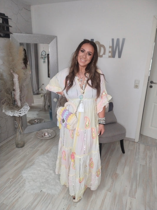 Maxikleid Boho in zartem gelb mit pink mit Glitzerapplikationen (Handmade)
