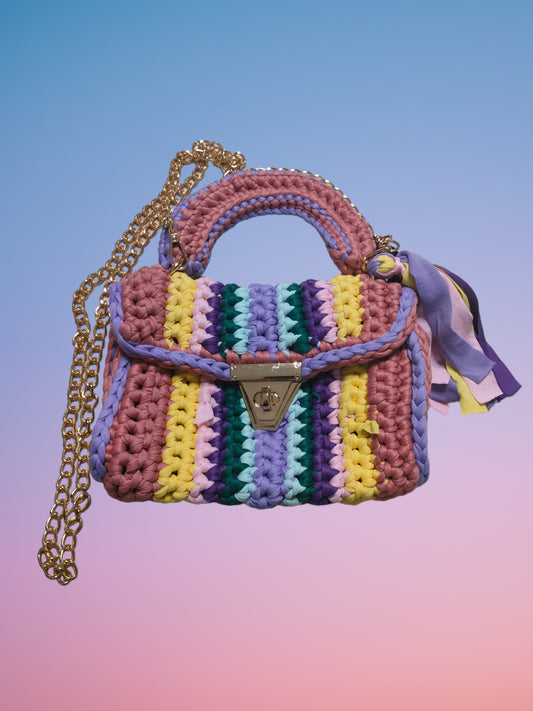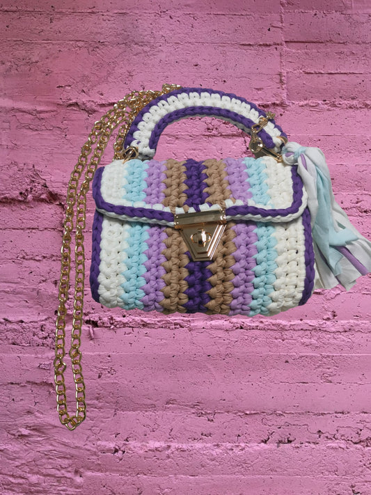 Kleine Boho Stricktasche mit Bommeln in verschiedenen Farben