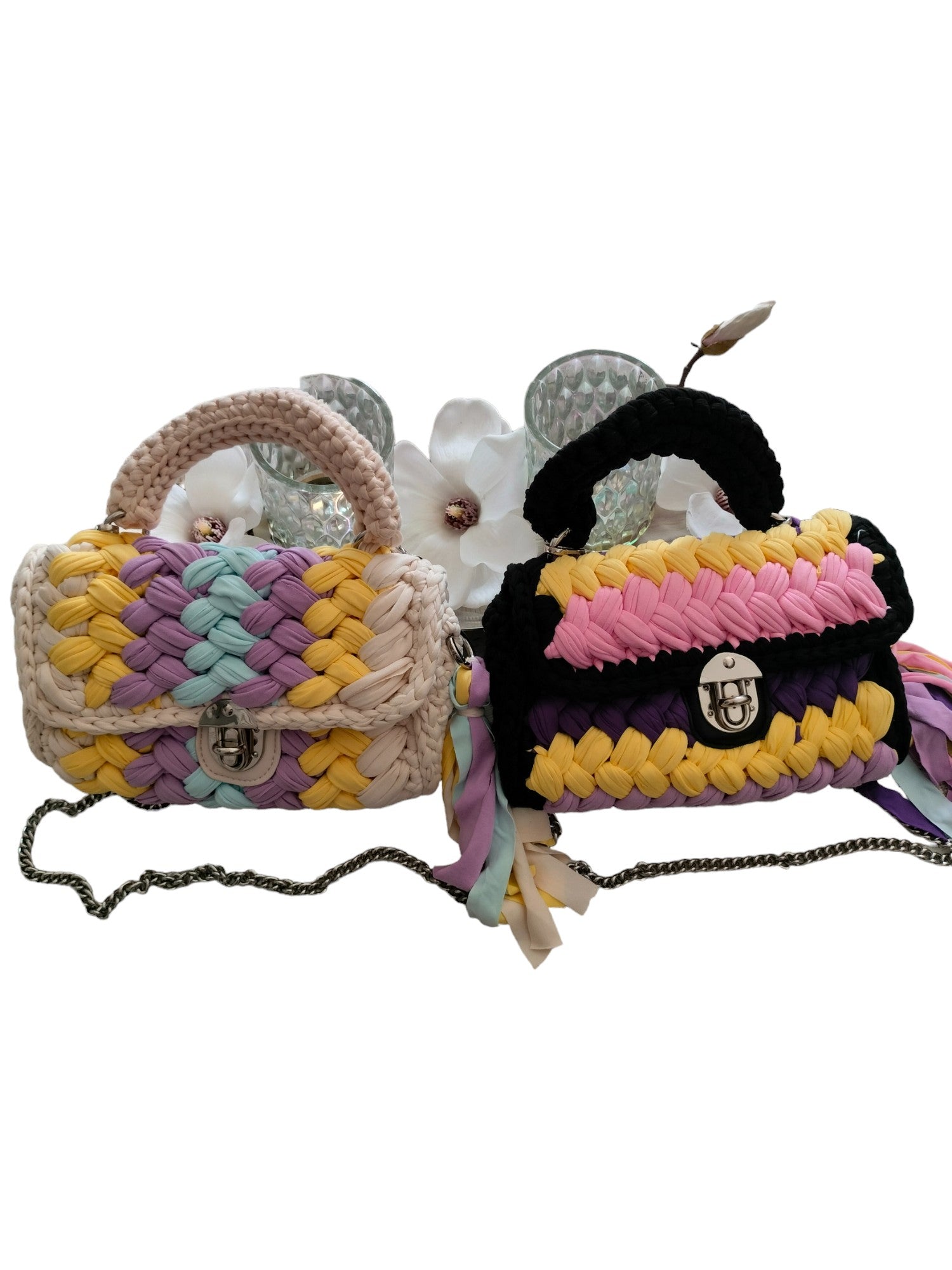 Kleine Boho Stricktasche mit Bommeln in verschiedenen Farben